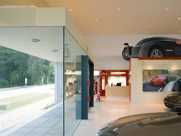 Verscheidene autoconstructeurs hebben een showroom langs de Kortrijksesteenweg in Latem. Het lijkt er wel Sunset boulevard met al de duurste automerken. Ferrari heeft drie verkooppunten in België: in Waterloo, Antwerpen en Sint-Martens-Latem. Omdat de werklast almaar toeneemt door het groeiend aantal Ferrari-bezitters, moest de garage absoluut uitbreiden. Er is heel veel ruimte in deze showroom, onderhoudswerkplaats en keldergarage. Stijl, discretie en verwondering: alle elementen zijn aanwezig in de nieuwe Ferrari-garage.