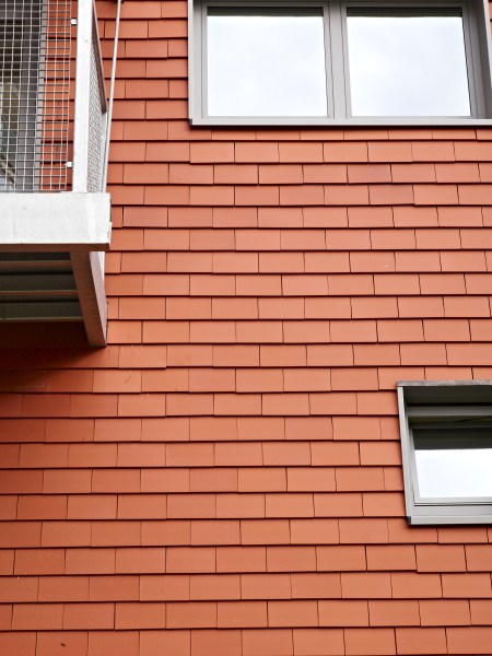 De bestaande gevel werd ontdaan van het parament, om vervolgens te isoleren en een nieuwe gevelbekleding in tegelpannen aan te brengen. Er is geopteerd om de isolatie in twee lagen te voorzien. Enkel de tweede isolatielaag werd geplaatst tussen verticale houten stijlen die de basis voor de opbouw van de gevelbekleding in tegelpannen. De verticale dragers van de gevel werden door middel van kleine consoles door de eerste isolatielaag verbonden op de bestaande draagstructuur van de gevel.