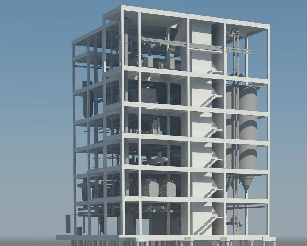 De gevel van de graanmaalderij zelf, wordt voorzien van sandwichpanelen, namelijk verticale bardages, bevestigd op de betonstructuur.
